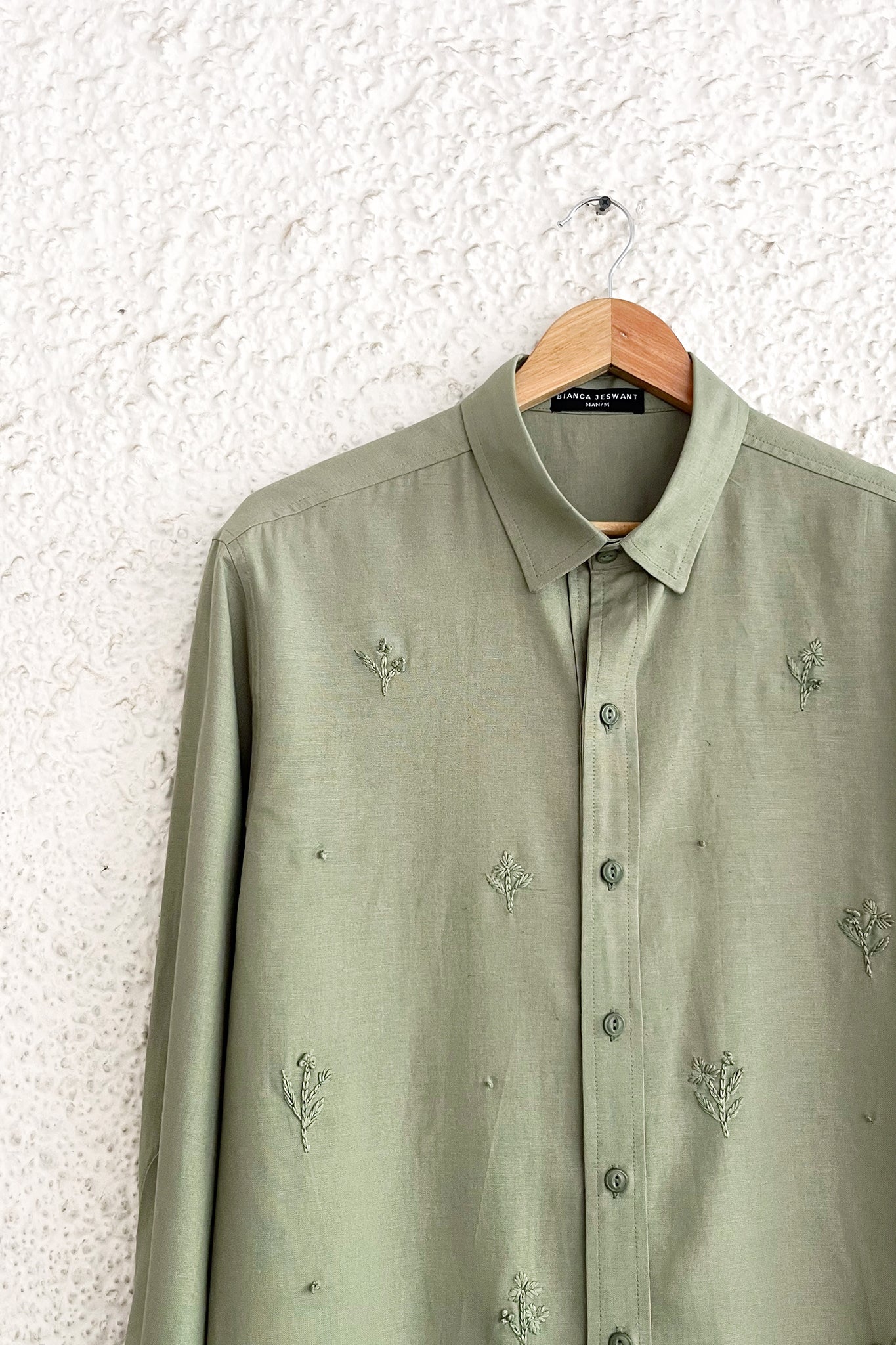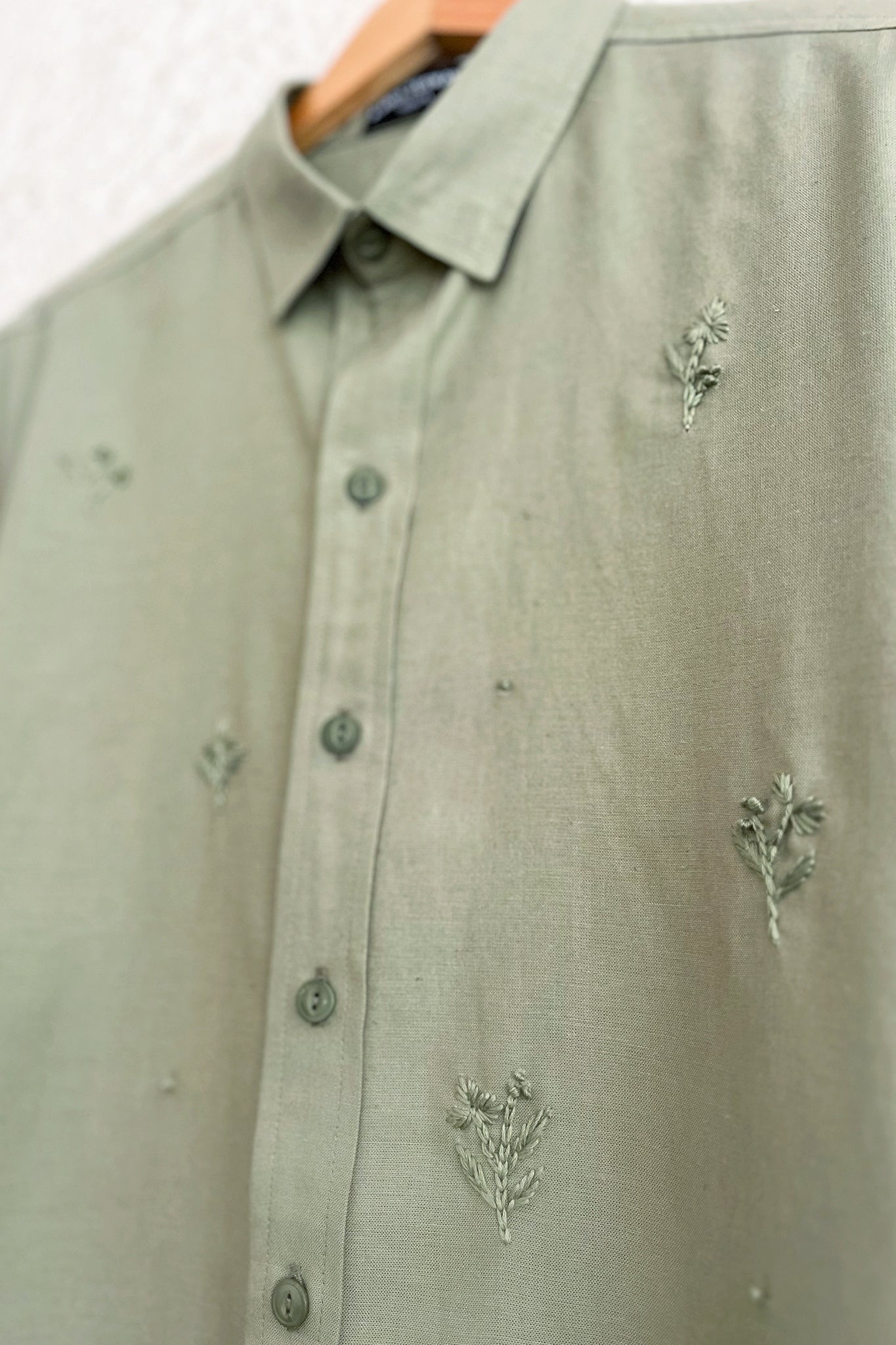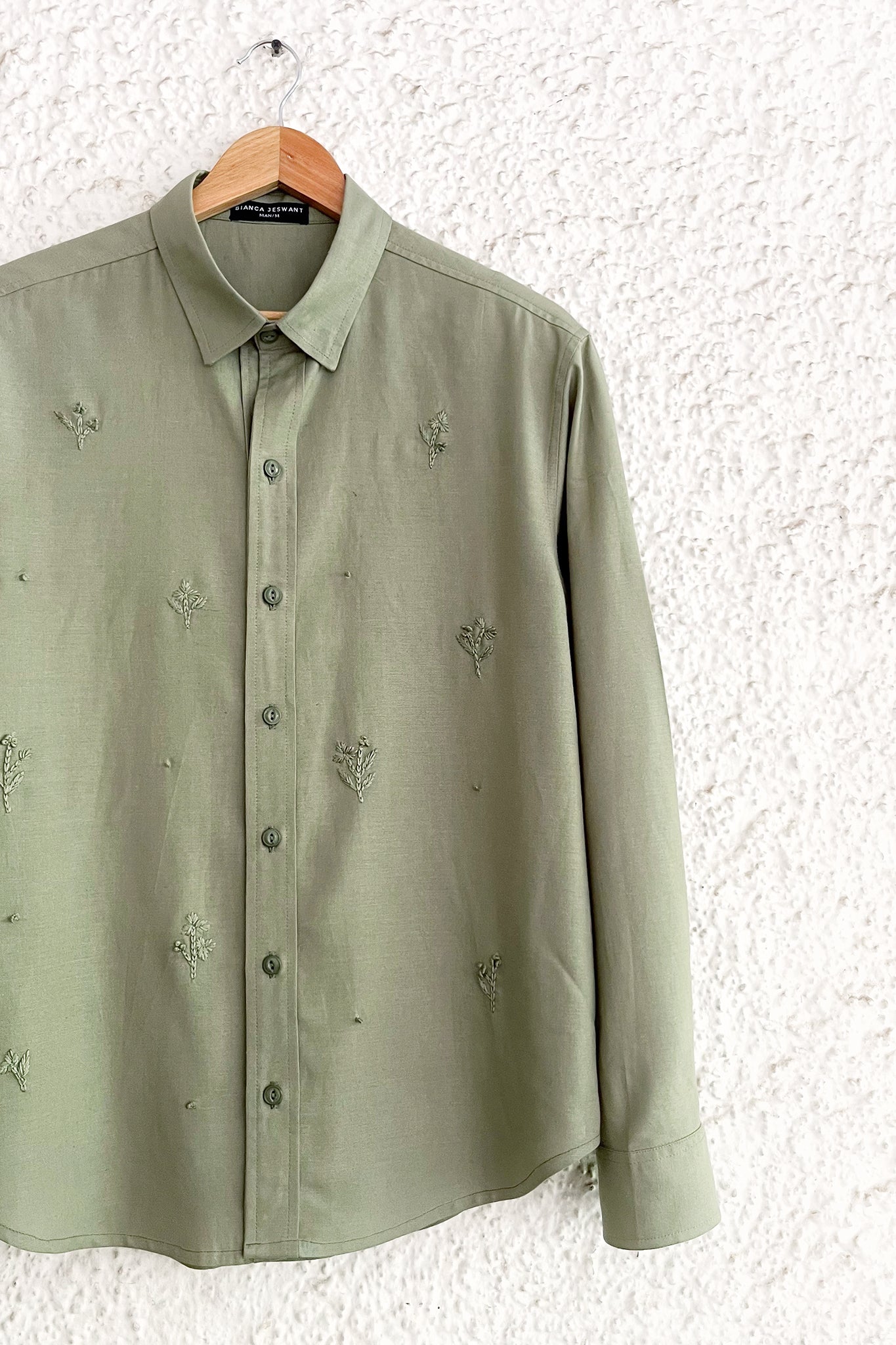 An ethereal shirt featuring delicate hand embroidered floral motifs in subtle shades of green.