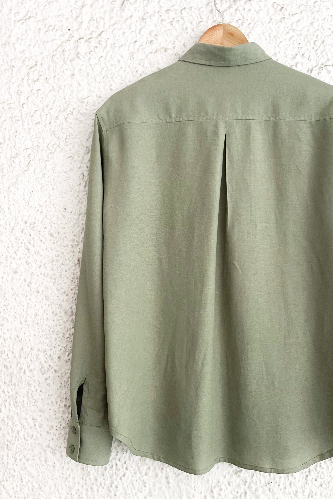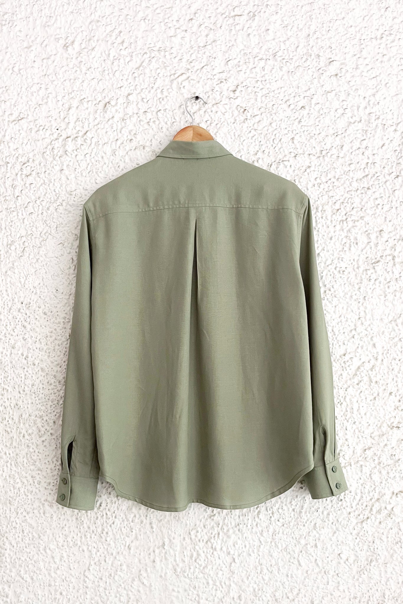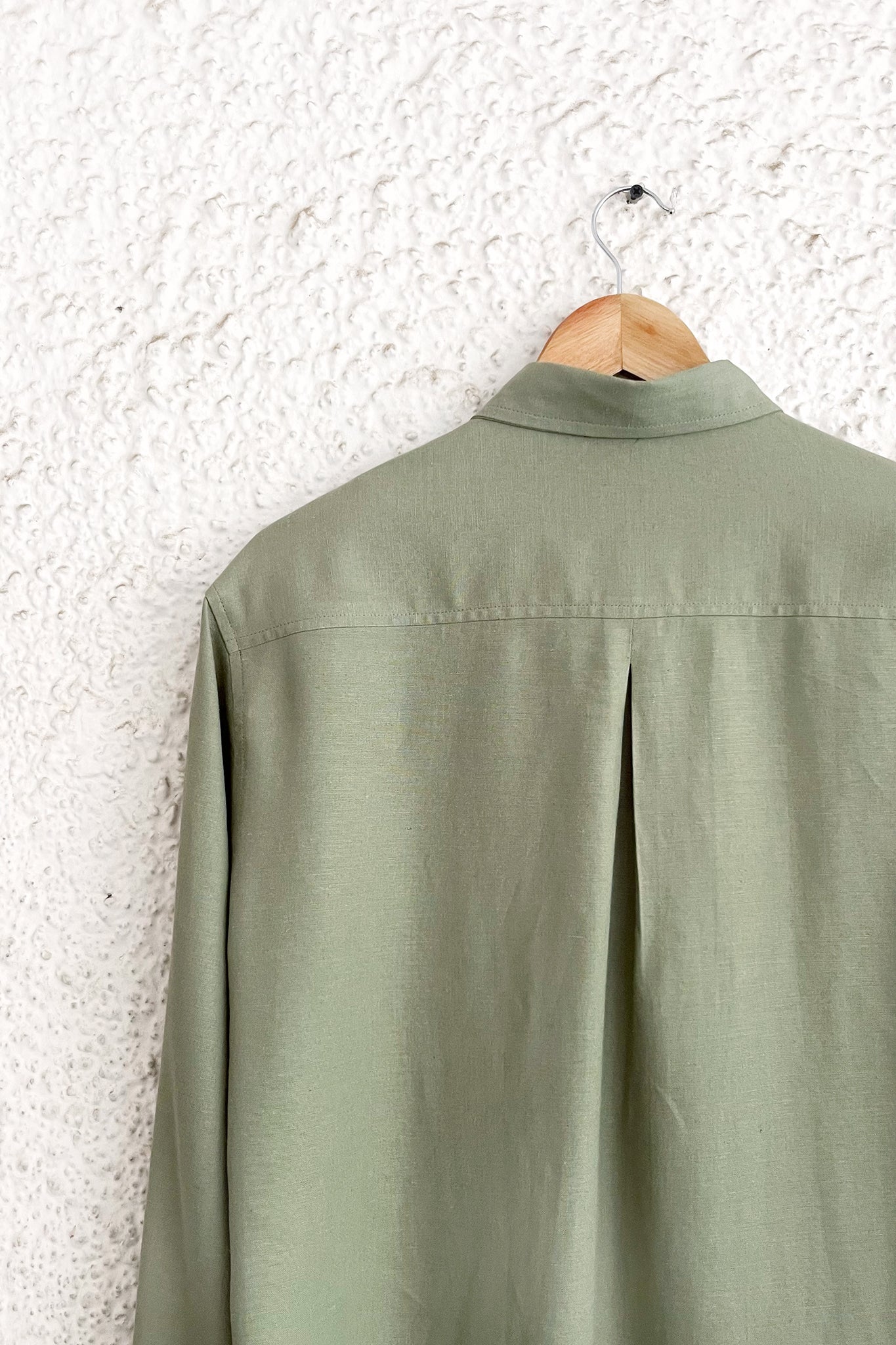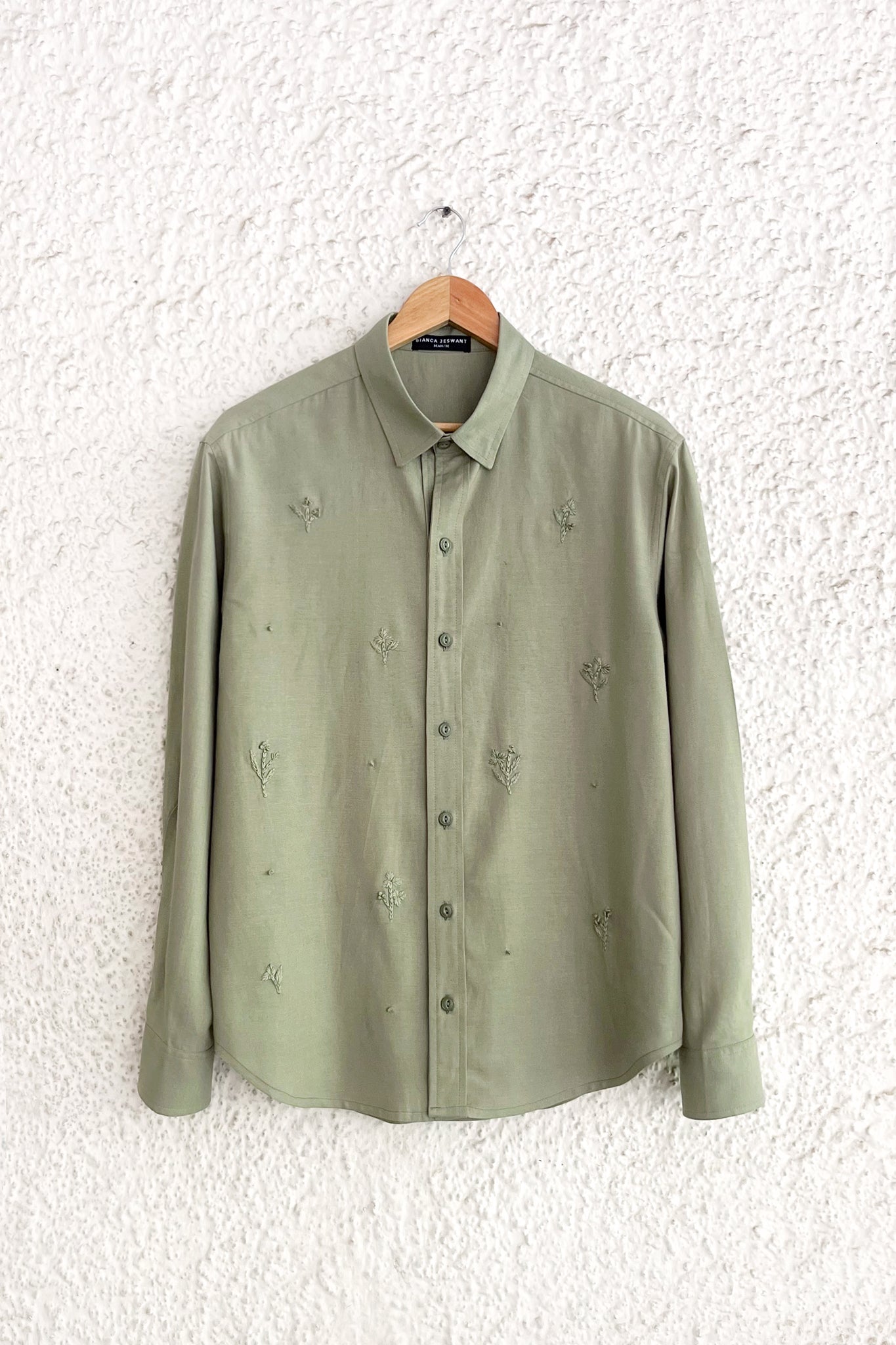 An ethereal shirt featuring delicate hand embroidered floral motifs in subtle shades of green.