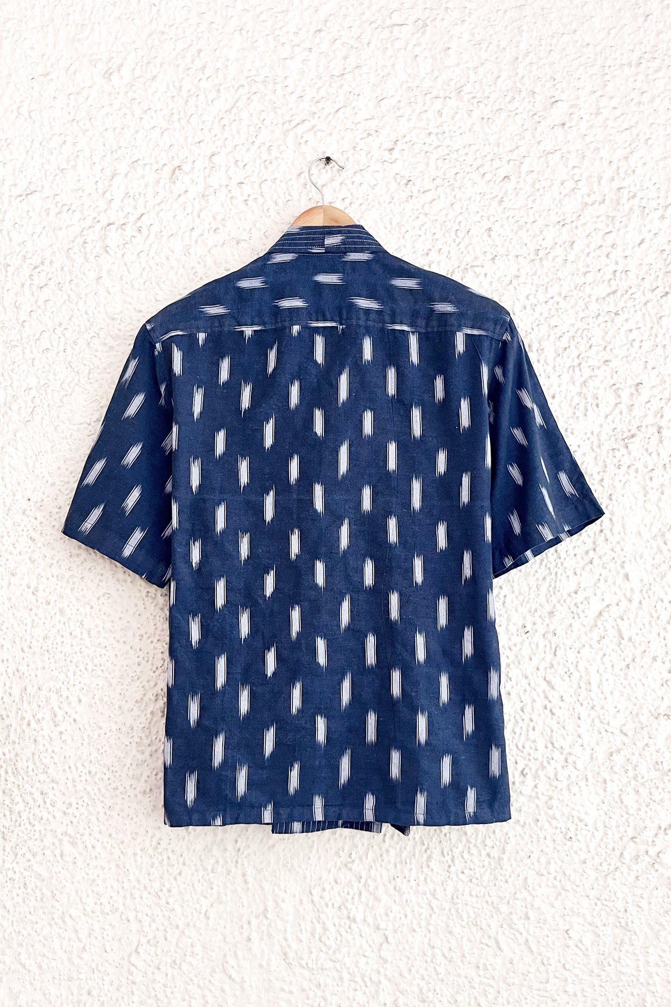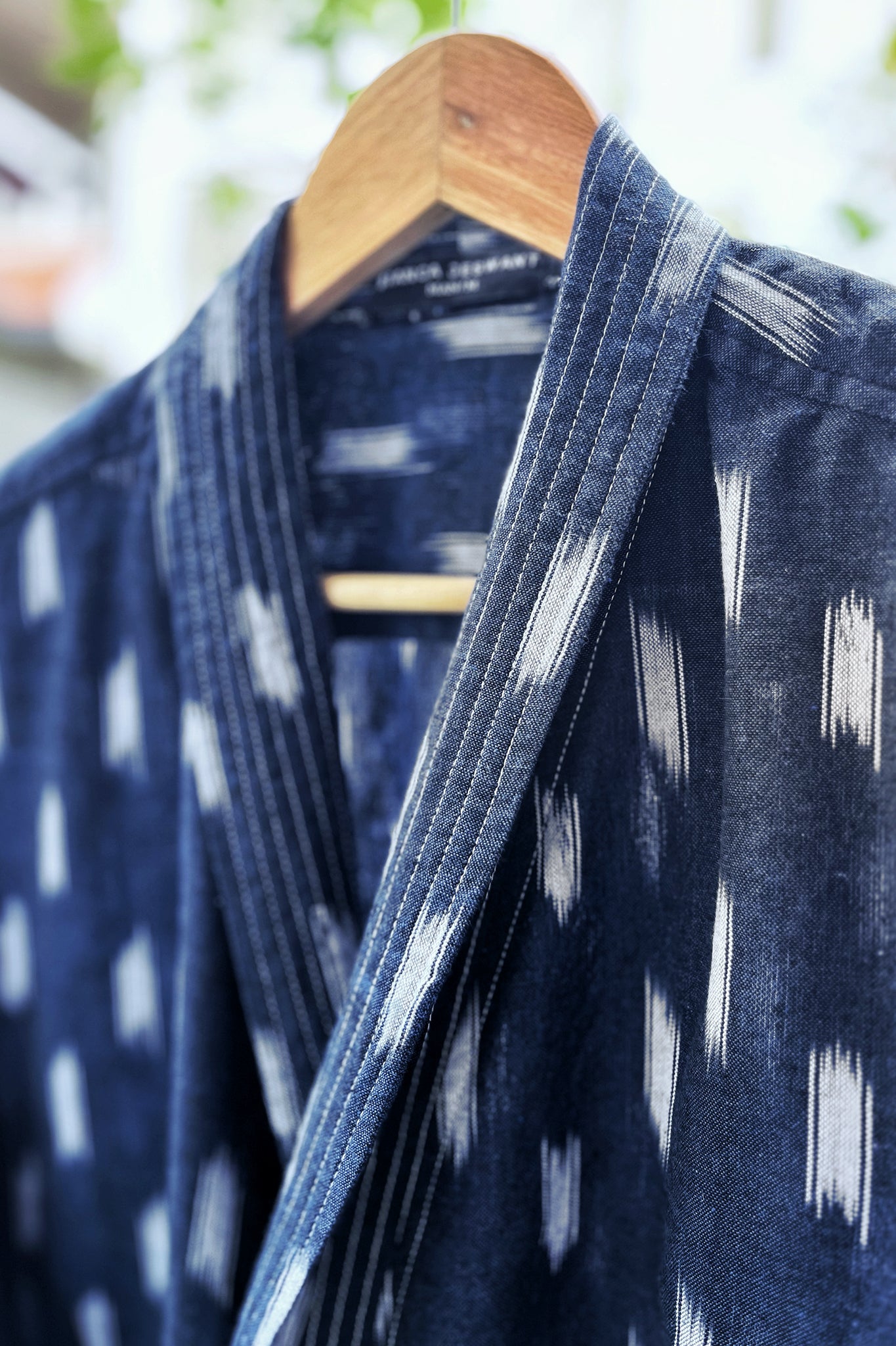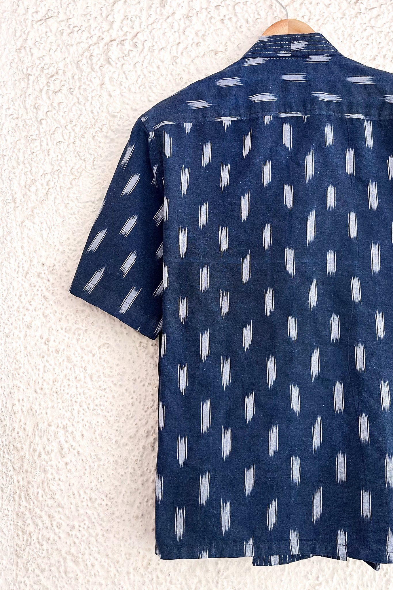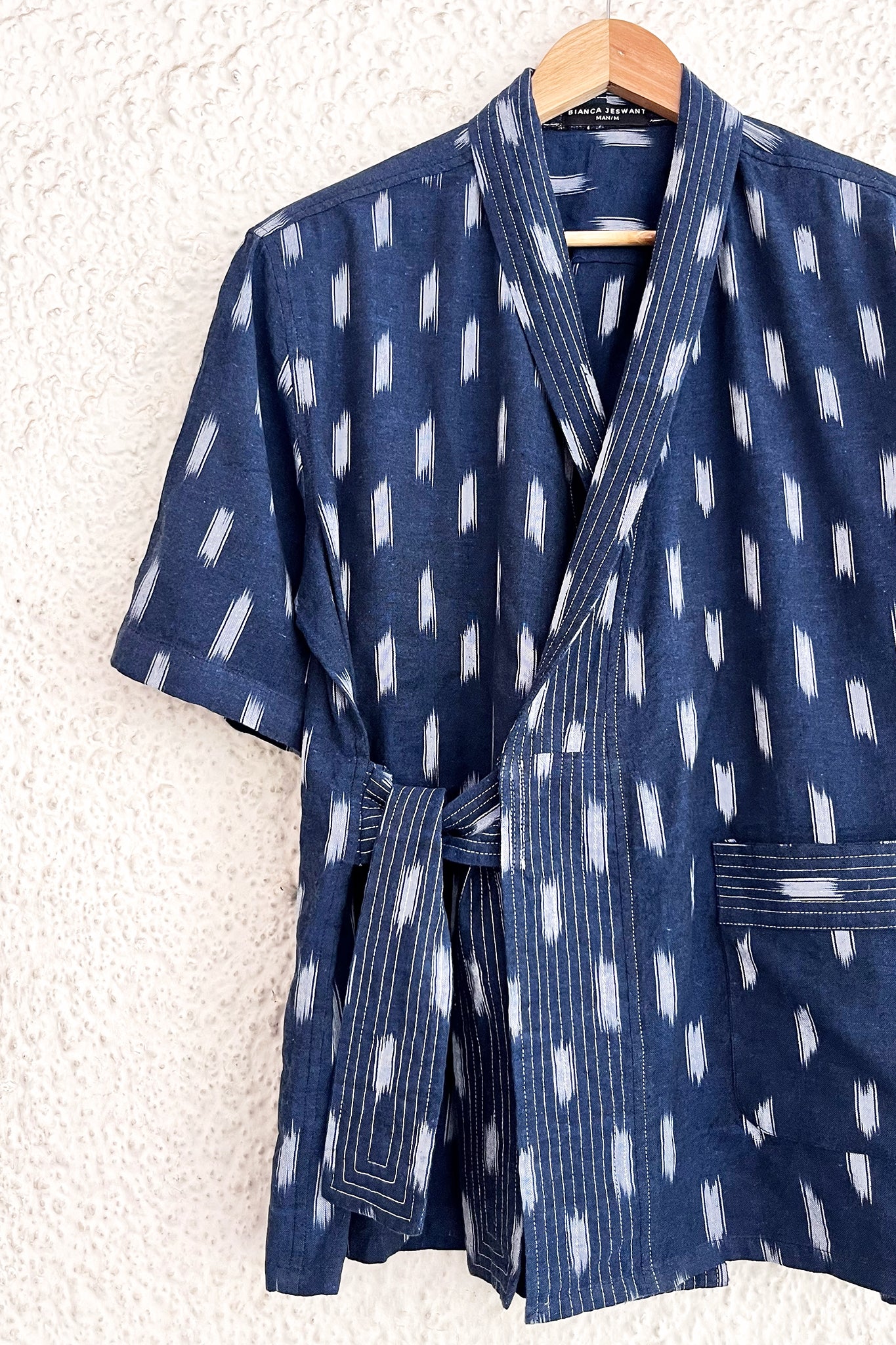 This unique shirt combines traditional textile and silhouette with a modern aesthetic for a fun festive statement look.