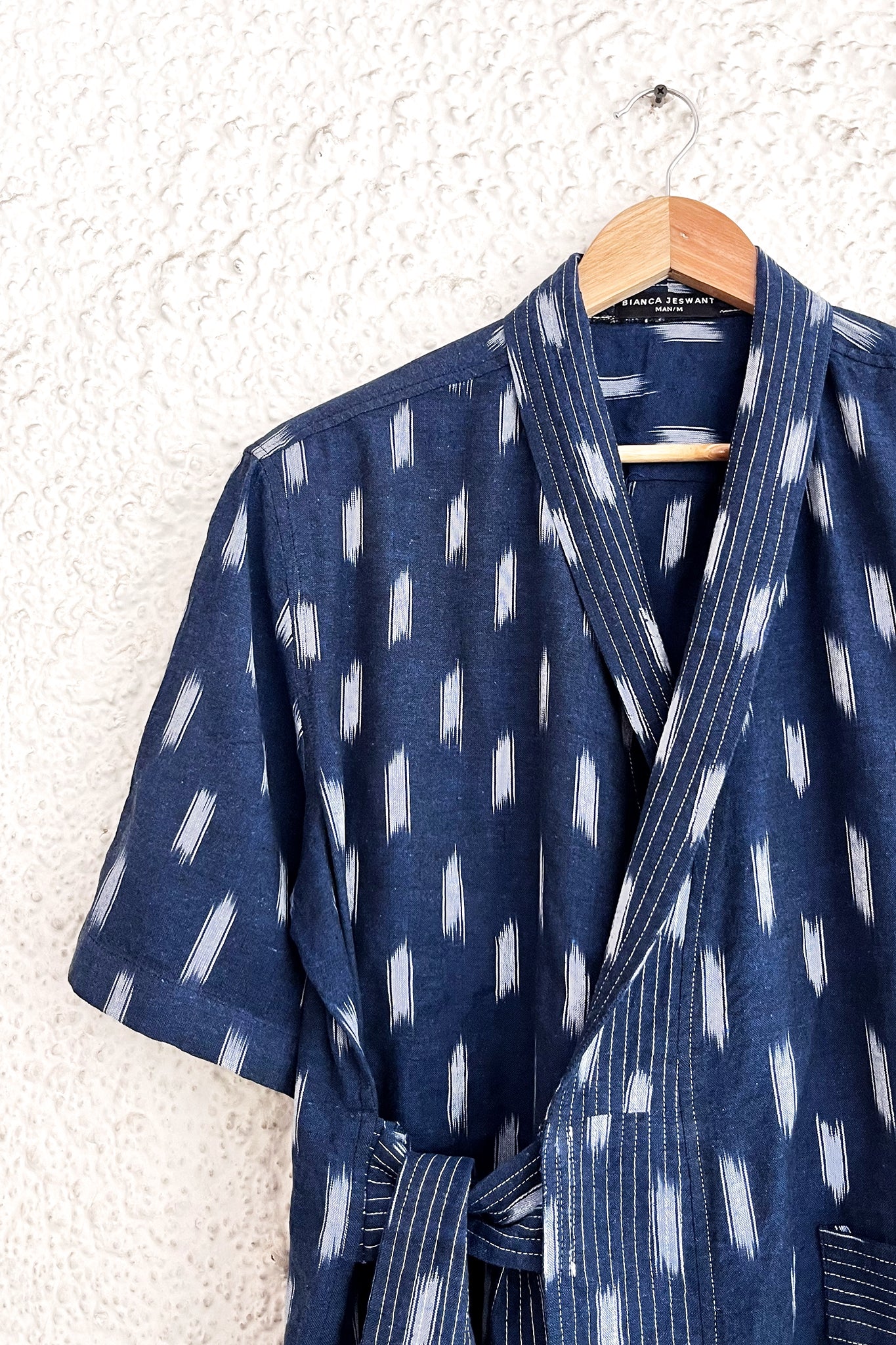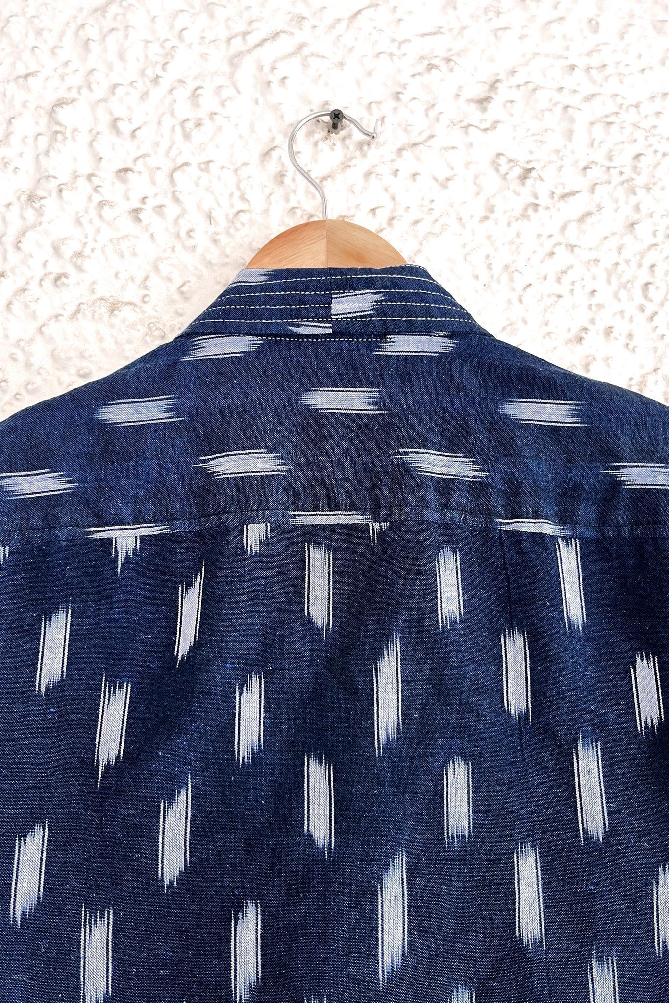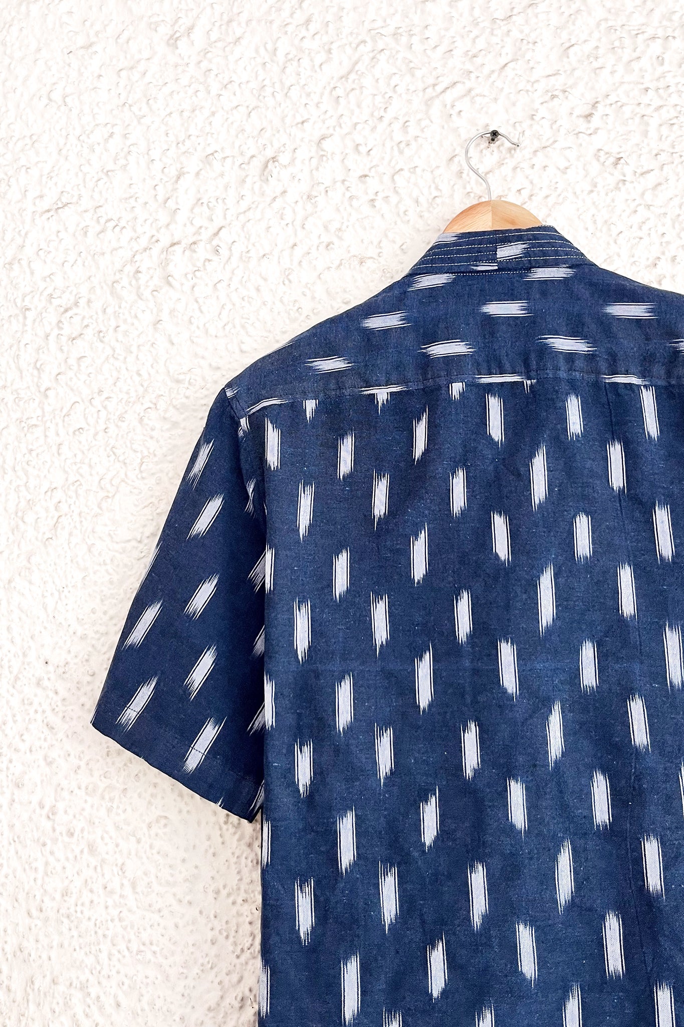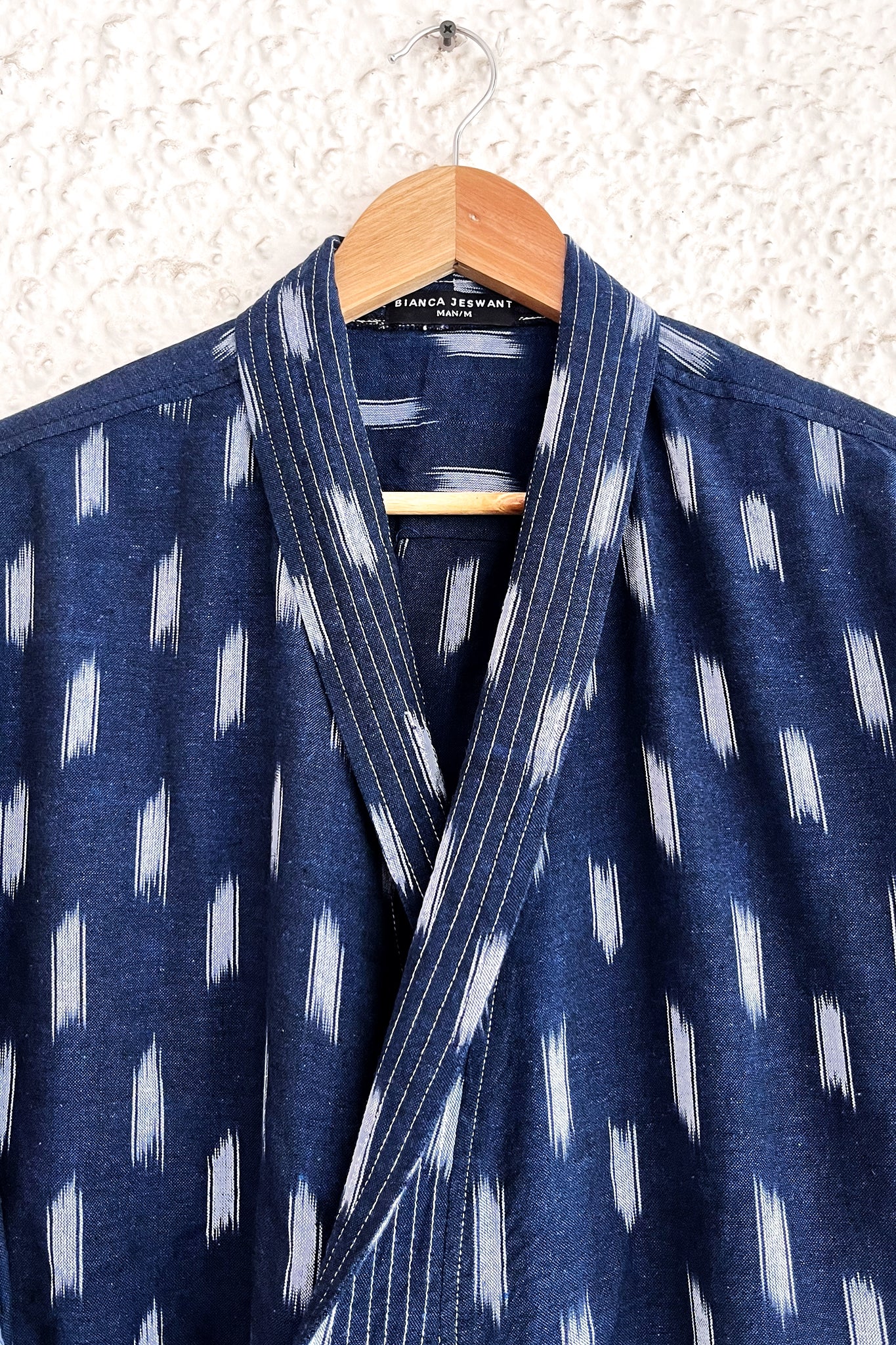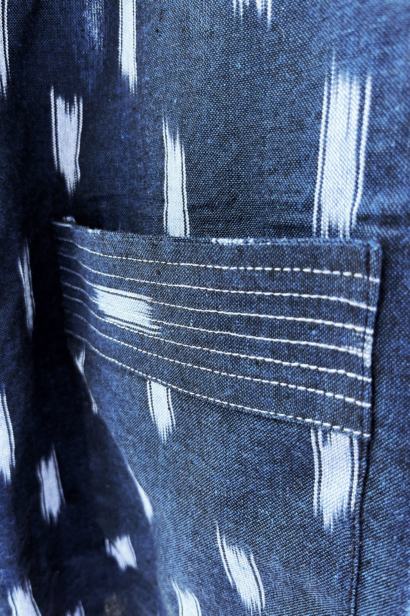 This unique shirt combines traditional textile and silhouette with a modern aesthetic for a fun festive statement look.