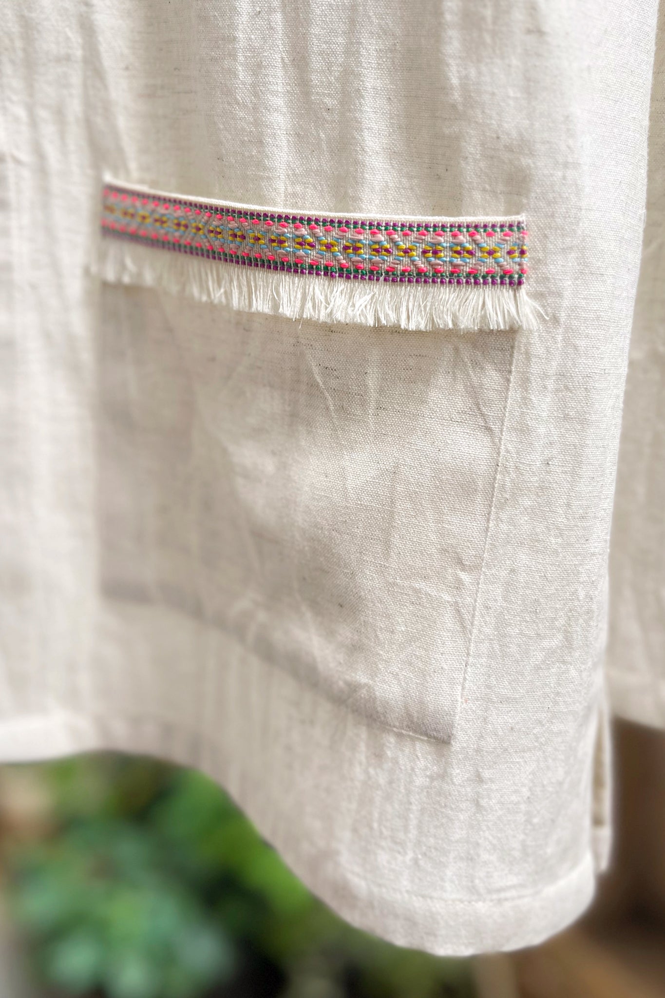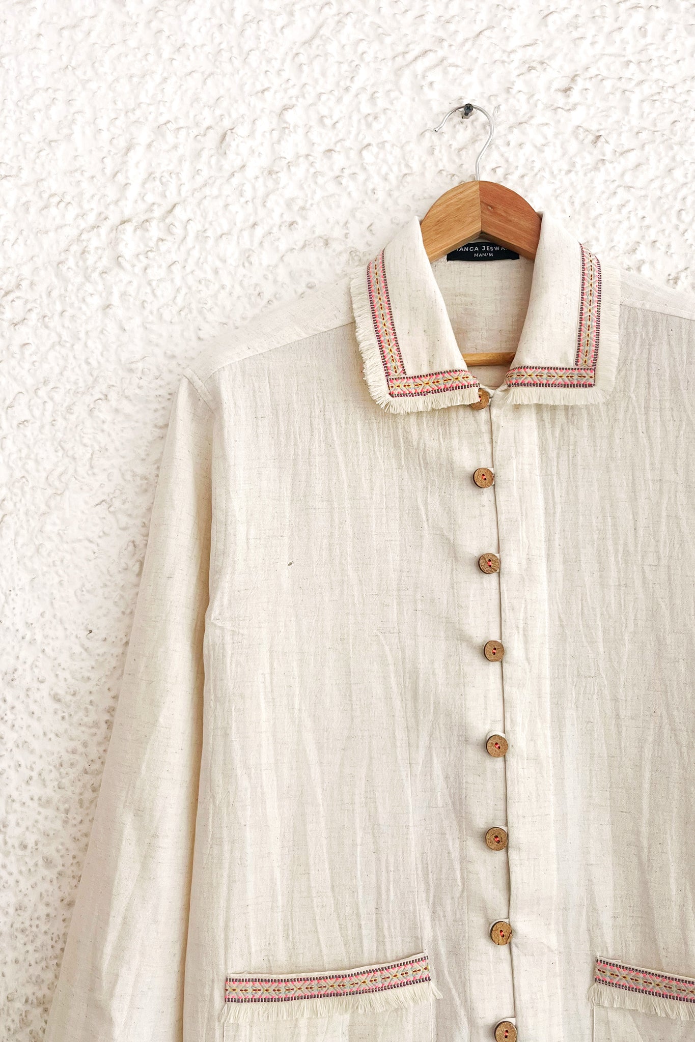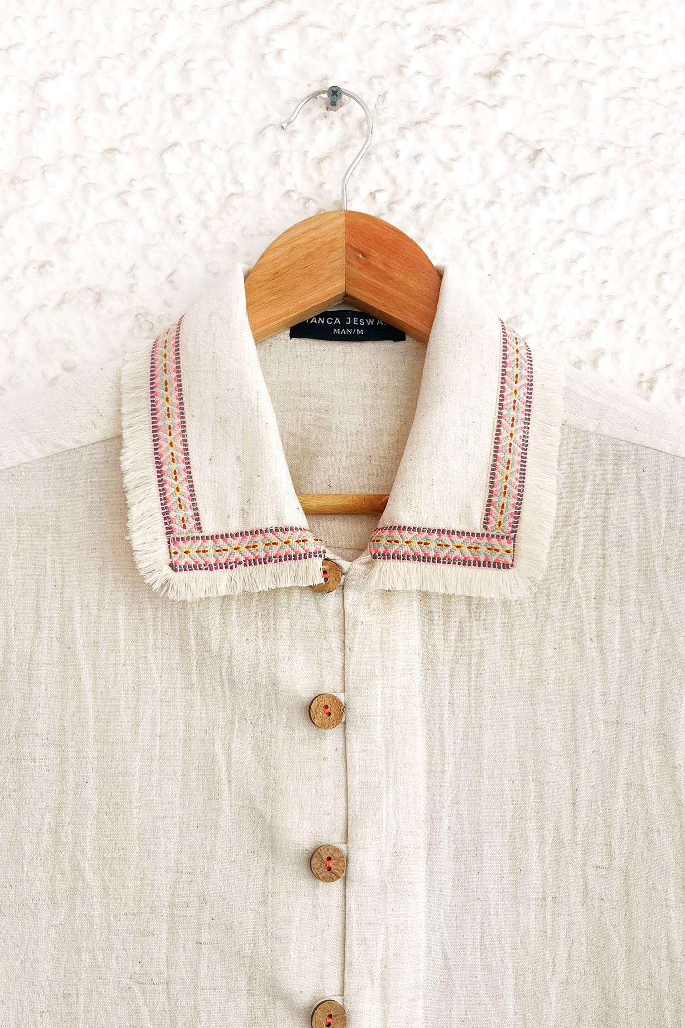 A muted but striking shirt in natural textured cotton, featuring fringed details on the collar and pockets.