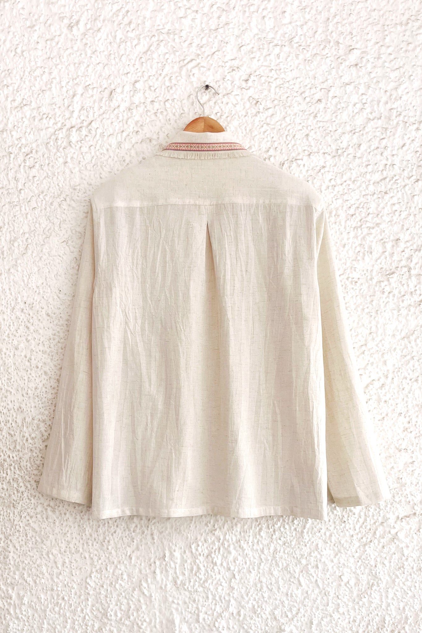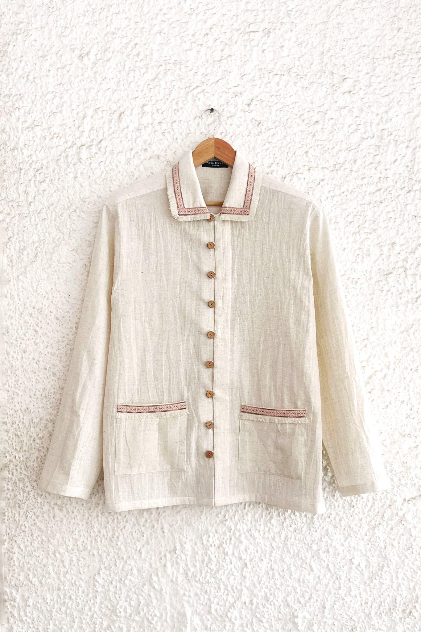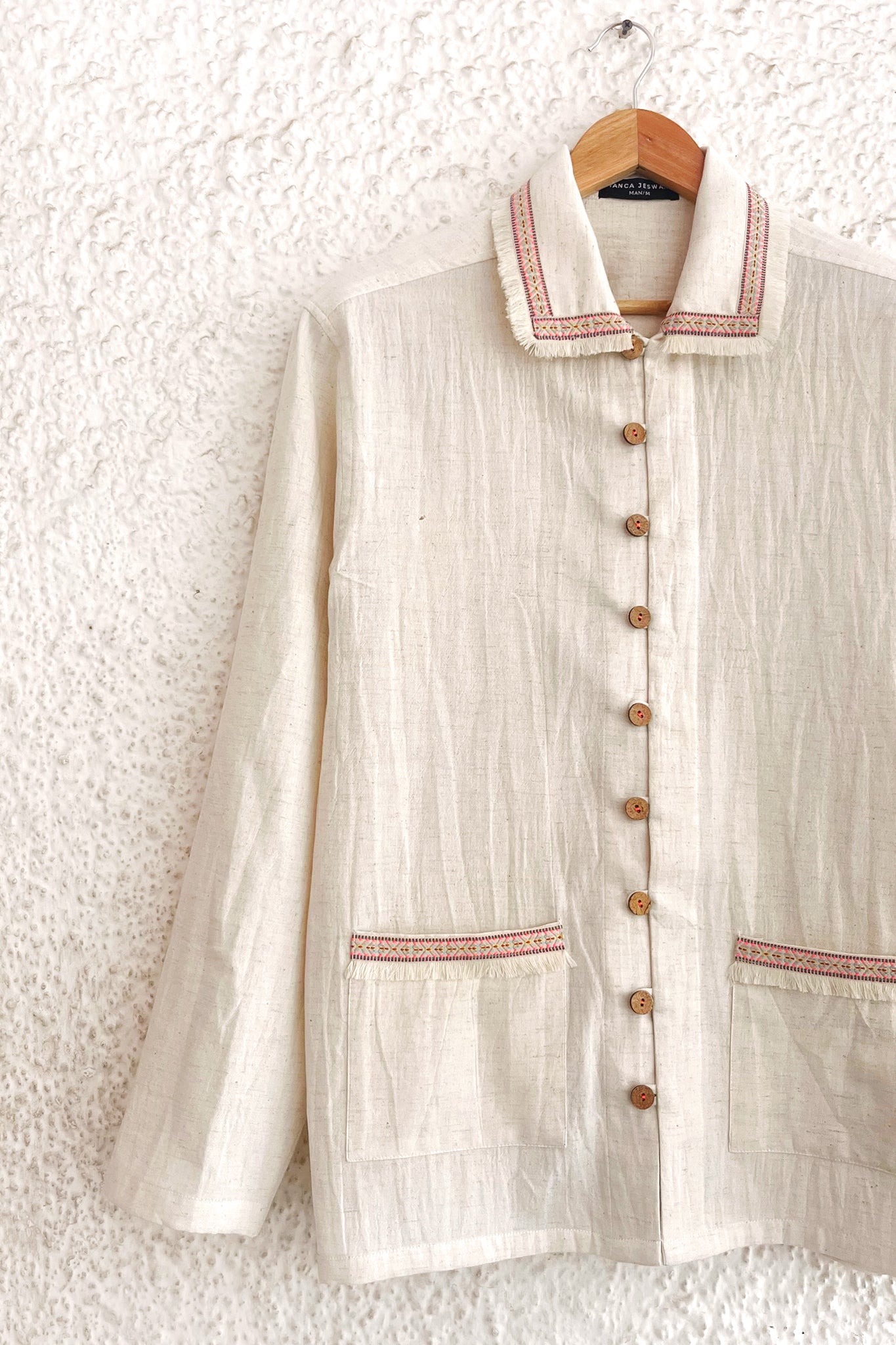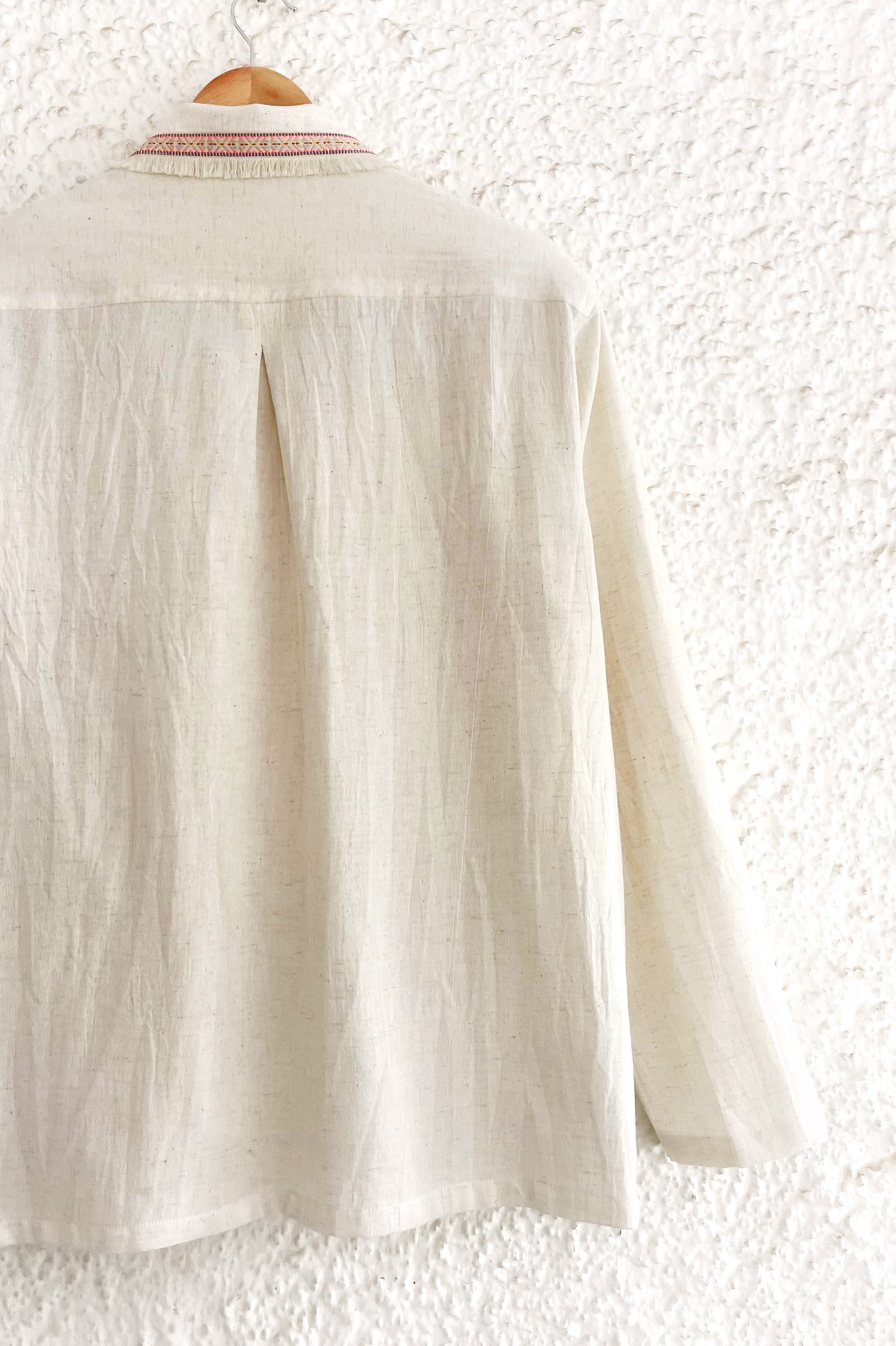 A muted but striking shirt in natural textured cotton, featuring fringed details on the collar and pockets.
